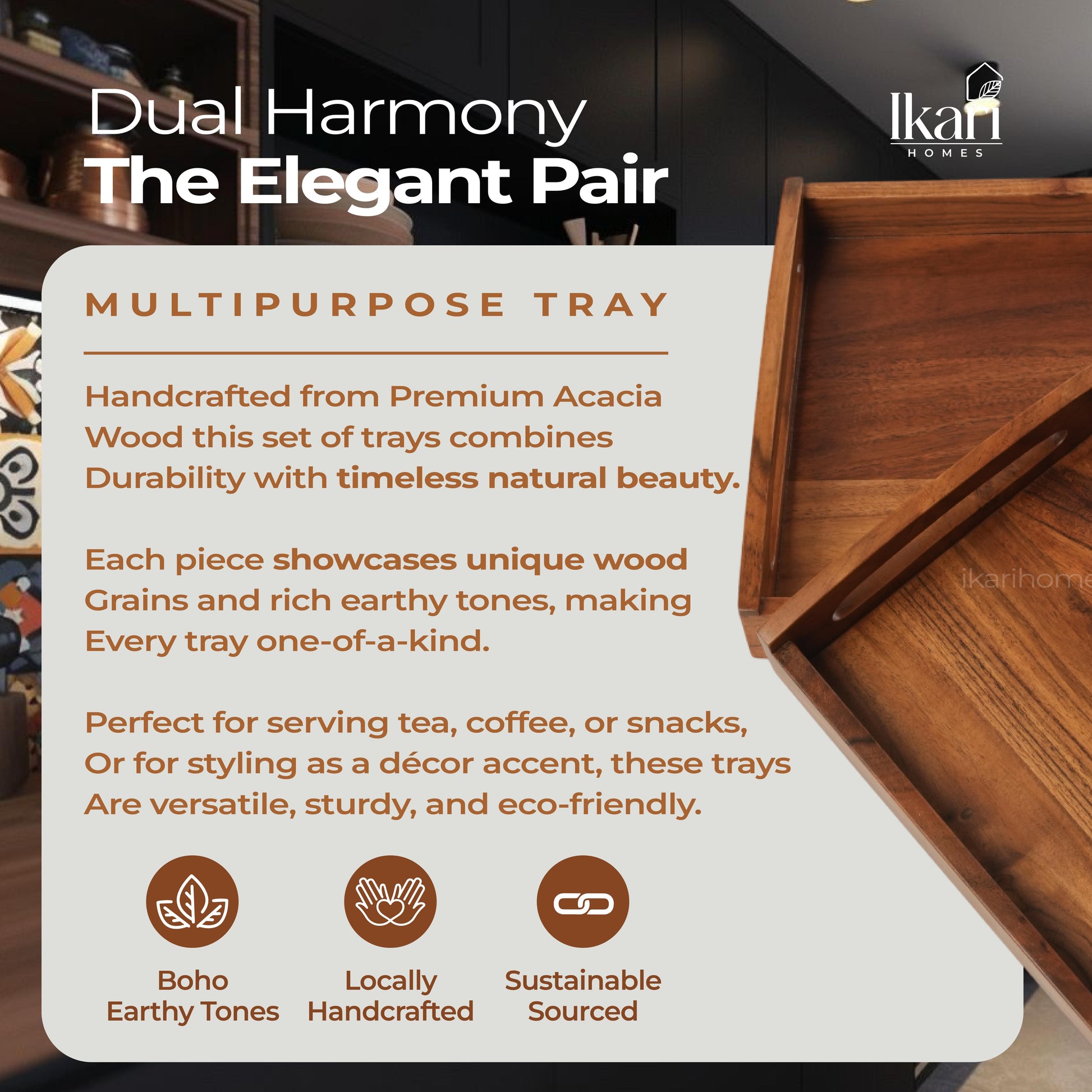 Add timeless elegance and functionality to your home with the Dual Harmony Multipurpose Tray Set of 2. Handcrafted from rich acacia wood, this set showcases the wood’s natural grain and dual-tone finish, offering a perfect blend of rustic warmth and modern style. Each tray is designed to complement any space — whether it’s your living room, kitchen, or bedroom.